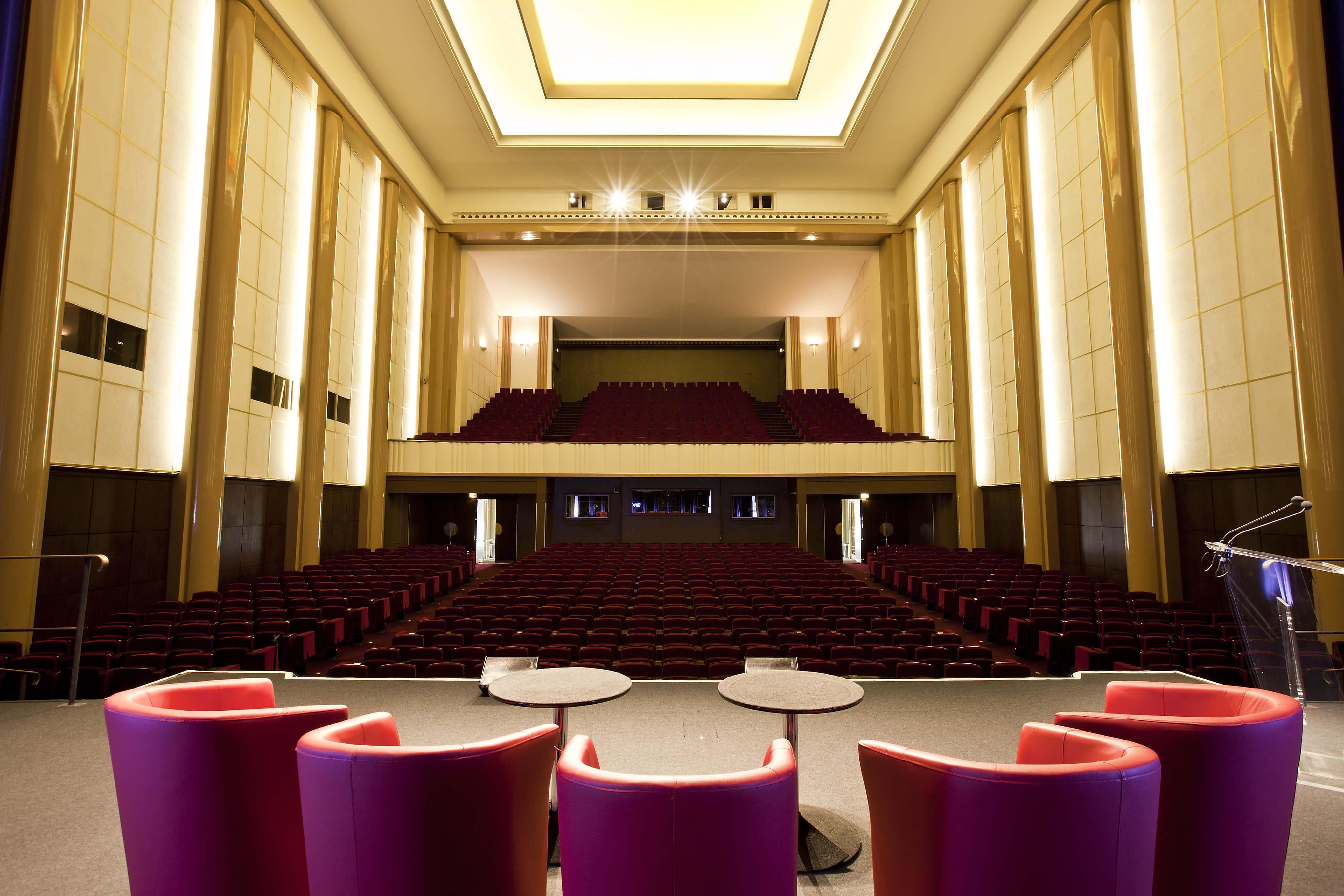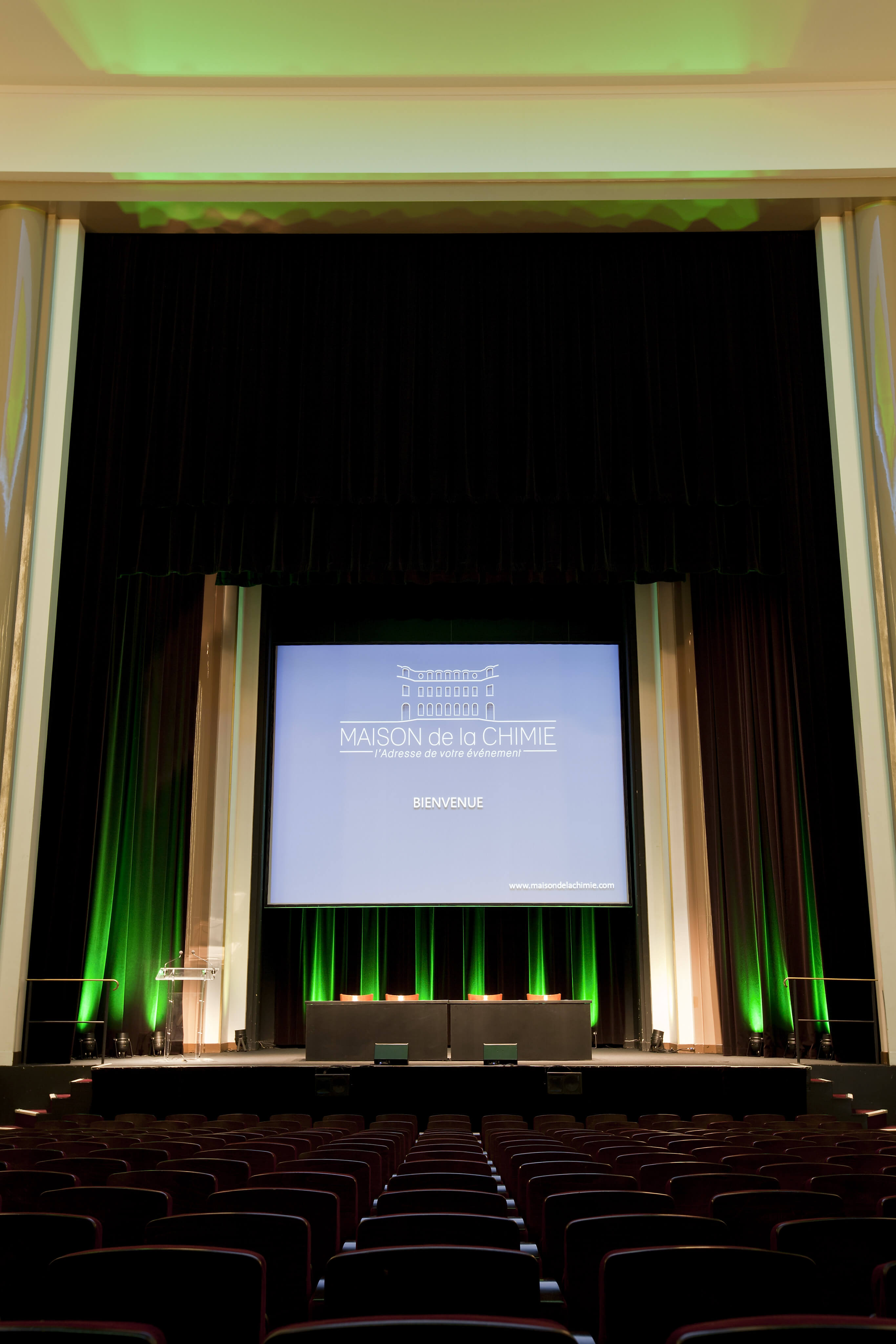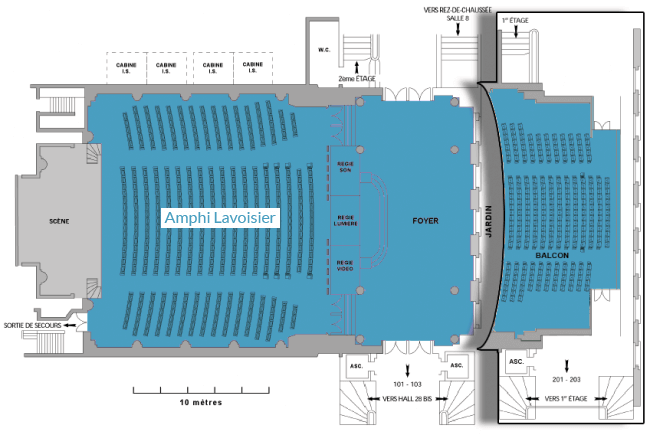 Amphithéâtre de 853 fauteuils (516 places au parterre et 337 places au balcon), climatisé, sonorisé et disposant d’un foyer d’accueil à la lumière du jour. 5 fenêtres (foyer) sur jardin (expo est). 1er étage de l’aile 28 bis.
