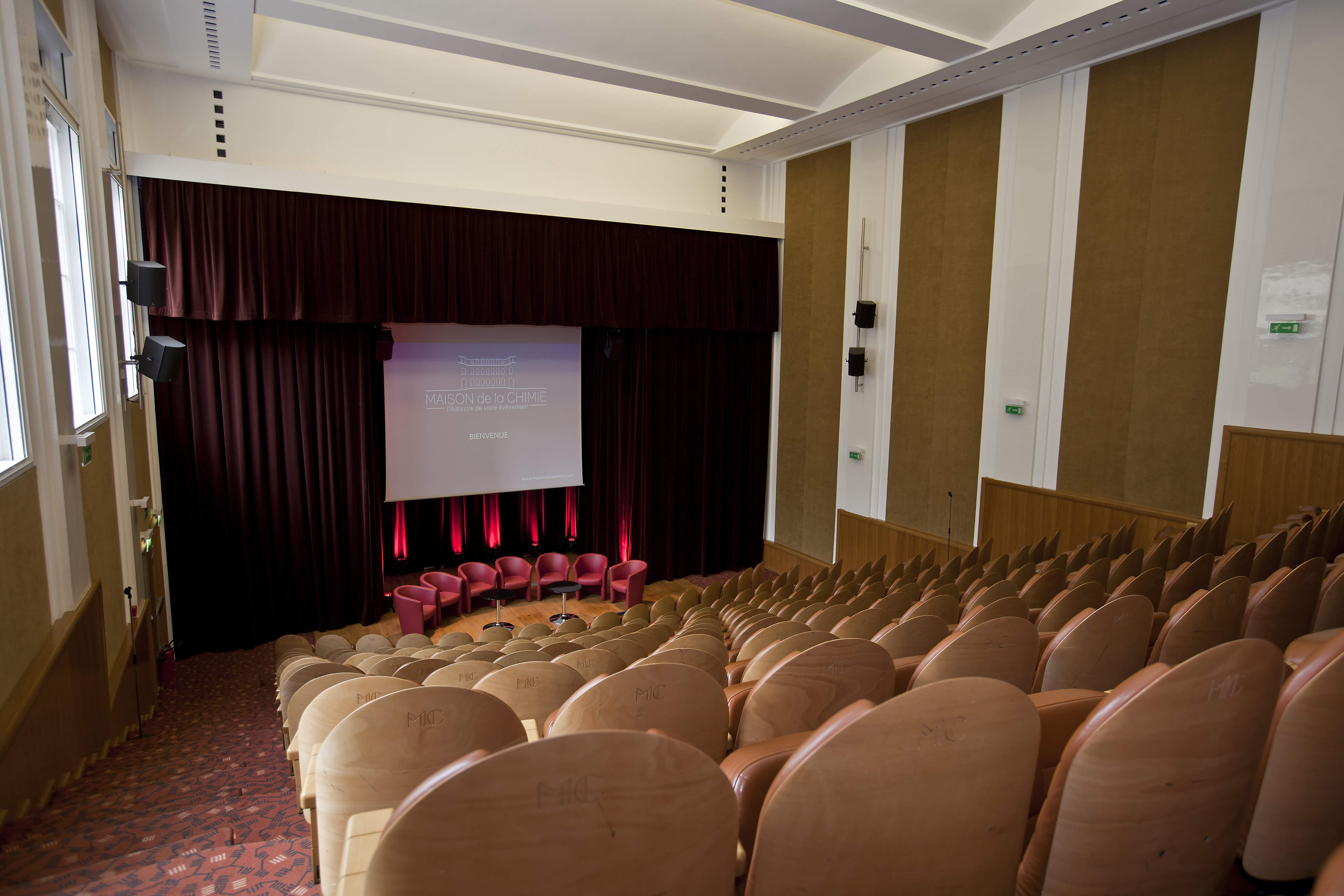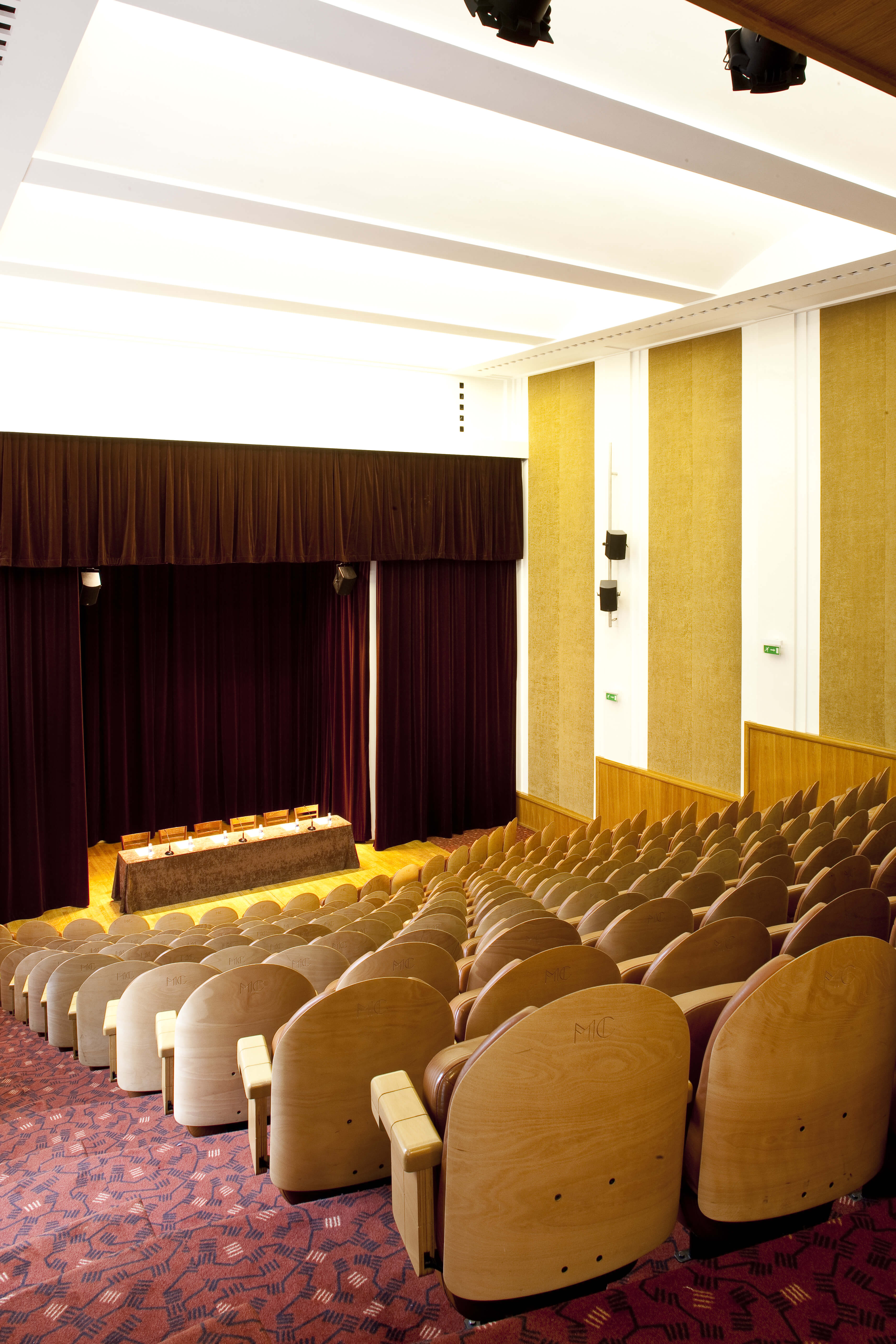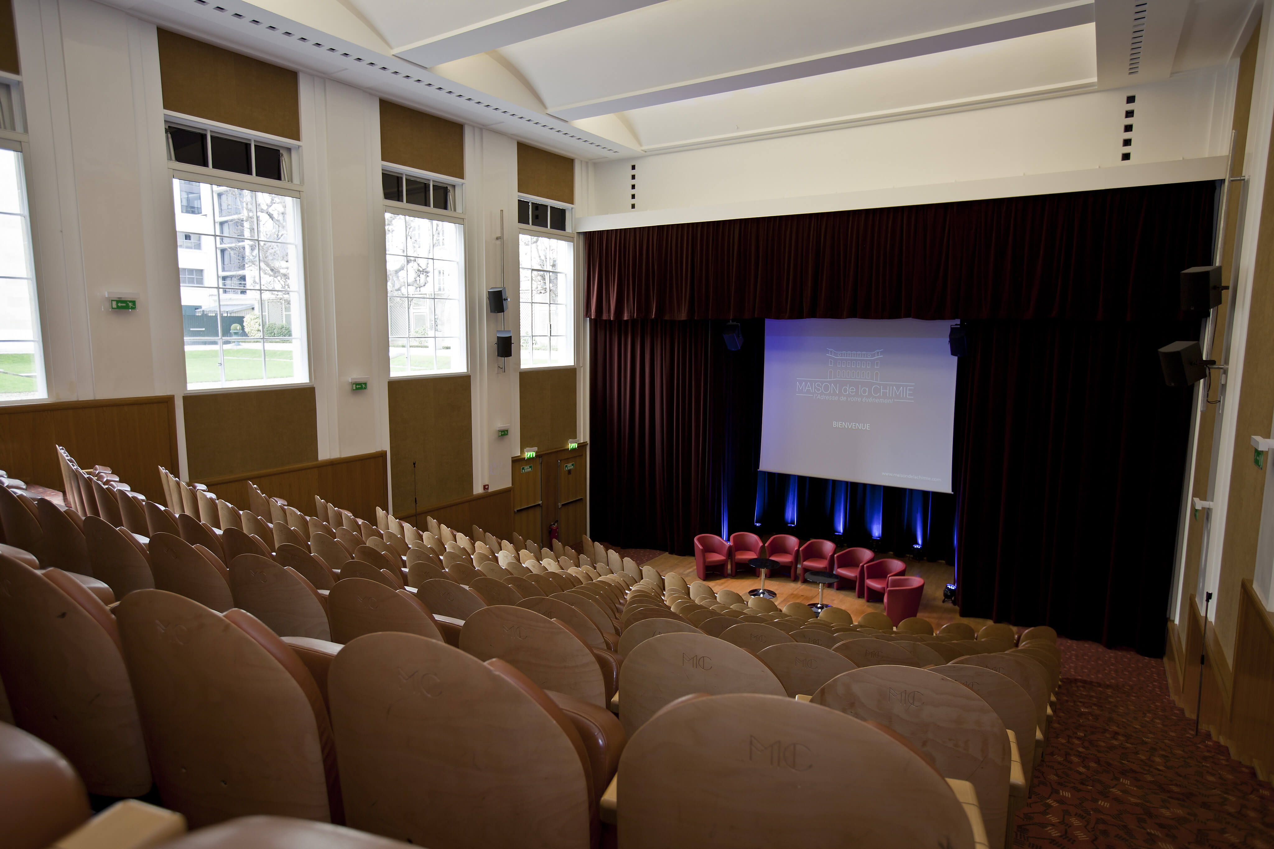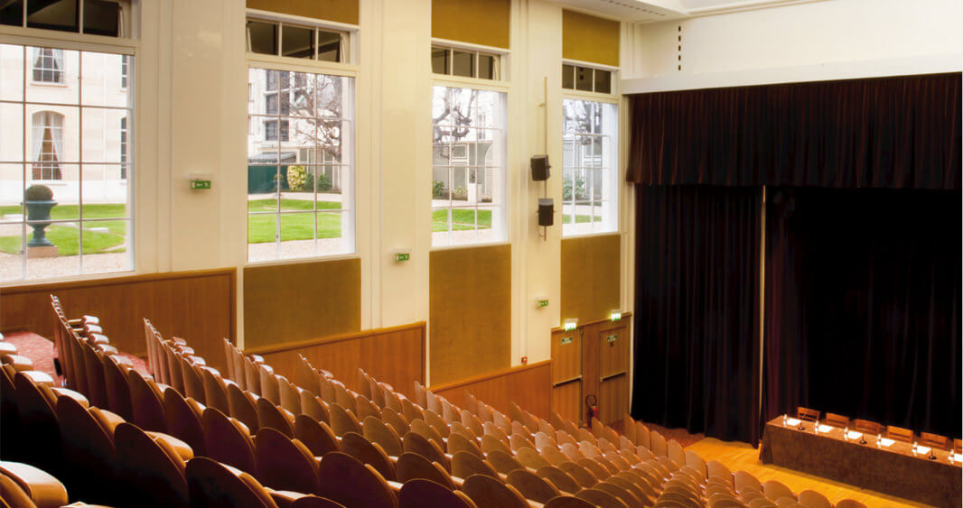 Amphithéâtre de 218 places, climatisé, sonorisé, à la lumière du jour, disposant d’un foyer d’accueil 4 fenêtres sur jardin (expo ouest). Rez de chaussée de l’aile 28. Déclivité 35% (22 degrés).